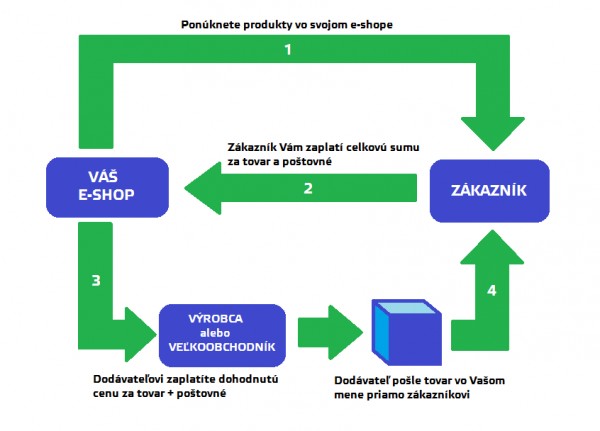 Zákazník si objedná tovar prostredníctvom predajcovho eshopu a zaplatí mu za neho cenu uvedenú v eshope. Predajca následne objedná tovar od svojho zmluvného dodávateľa, ktorý tovar nezašle predajcovi, ale priamo predajcovmu zákazníkovi. Tovar je zákazníkovi zasielaný menom predajcu, tj. S jeho fakturačnými údajmi.